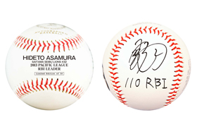 浅村選手の今季成績が刻印されたオリジナルのボールに直筆サインが入った「直筆サイン入りボール」、浅村選手の数々の活躍を収めたデザインフォトに直筆サインが入った「直筆サイン入りフォト」には、いずれも本人のサインに加え、「110RBI」(run batted in=打点)の書き入れもされる予定のプレミアムアイテムです。