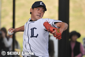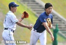 投内連係の後、投手陣はブルペンへ移動。一番最初に投球練習を行ったのは岡本洋投手。シュート、スライダーと変化球を投げる際には握りをチェックして、ボールを投げ込みます。62球を投げ終えると、ボールを受けた吉見ブルペン捕手にボールの変化について確認していました。