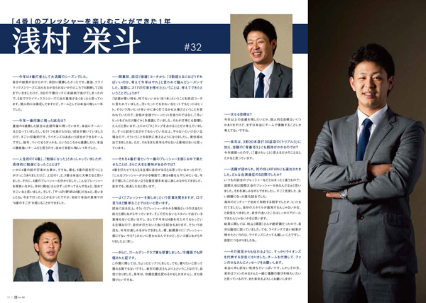 2008年からチームを6年間に渡り指揮した渡辺久信 前監督(現・シニアディレクター)からファンの皆さまへのメッセージや、今シーズン途中からライオンズの4番に座り、打点王のタイトルやゴールデン・グラブ賞も獲得するなど大ブレイクを果たした浅村栄斗選手の独占インタビューを掲載!今シーズンの振り返りや、タイトルのこと、そして初の日本代表として出場した台湾戦のことまで語ってくれました。