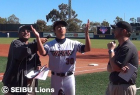 「初めてグラウンドに出てチームのみんなとも初めて会った。今回は日曜日で試合だったので試合前に軽く体を動かし試合はベンチで見ていた。試合を見て感じたことはストライクゾーンが日本より広いと思った。タイミングの取り方もストレートに合わせた間の取り方のバッターが多かったので変化球は使いやすいと思った。」