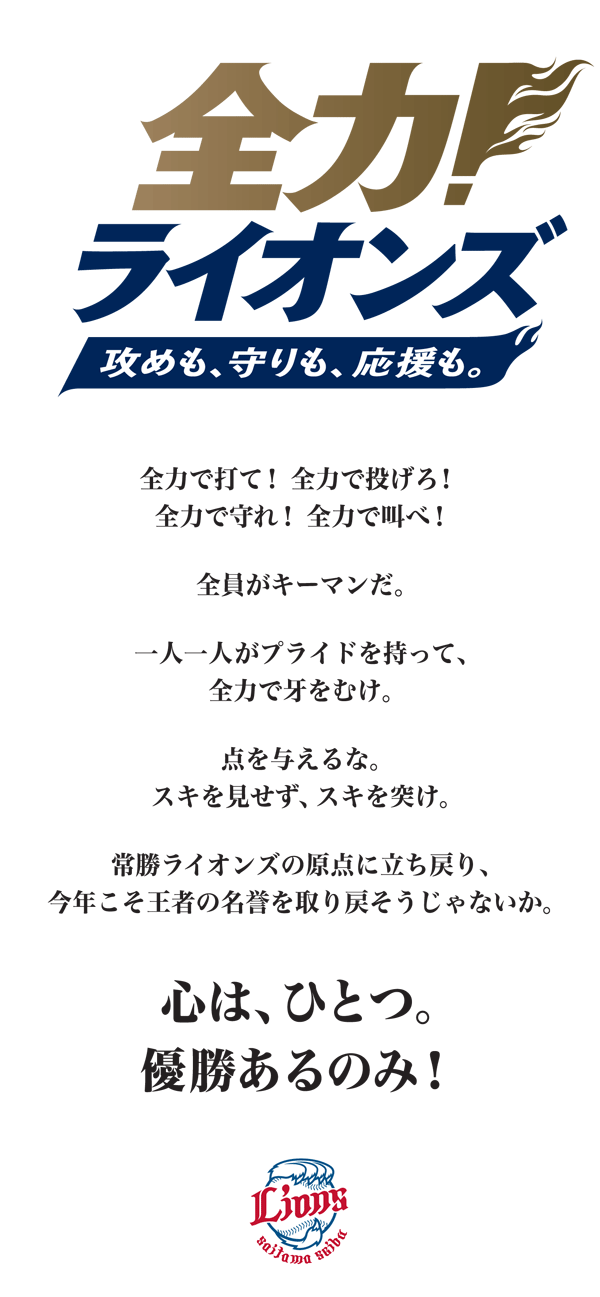 埼玉西武ライオンズは、2014シーズンのチームスローガンを「全力!ライオンズ ~攻めも、守りも、応援も。~」に決定しました。