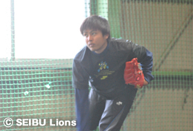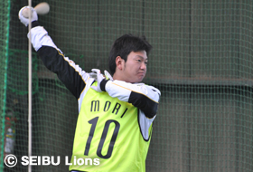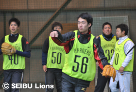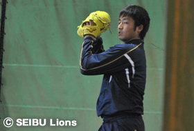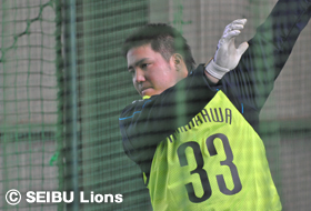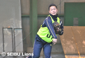 森、岡田、山川、金子一ら野手4選手は、西武第二球場でトスバッティングを行い、投手陣は室内練習場に場所を移し、豊田投手、福倉投手がブルペン入り。自主トレ初日から熱のこもった投球を披露します。