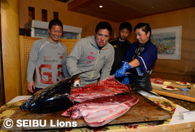 また、宿舎に到着し18時からは毎年恒例の「マグロの解体ショー」! 豊田・岡田・山川のルーキー3選手が参加し、地元で釣り上げられた約50キロのメバチマグロに包丁を入れました。