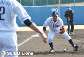 簡単なゴロをしっかりと捕球し相手に返す、プロと言えども基本の反復練習でしっかりと基礎から鍛えていきます。