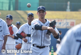 また、今シーズンより加入した新外国人投手も初めてブルペン入り。身長201cmの長身から角度のある球を投げ下ろすレイノルズ投手は捕手を座らせ、直球やカーブなど力強い球を投げ込み、持ち味でもある安定したコントロールを披露。見守るコーチ陣も納得の表情でした。