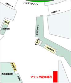 | 配布方法 | 持参していただいた21日のライオンズ応援席チケットに押印の上、チケット1枚につき1本「特別応援フラッグ」をプレゼントさせていただきます。 |