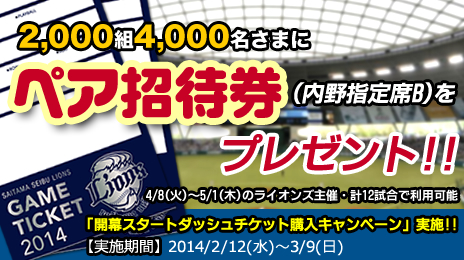 3・4月のライオンズ主催試合(公式戦)のチケット購入者の中から、抽選で2,000組4,000名さまに、招待券(内野指定席B)が当たる「開幕スタートダッシュ チケット購入キャンペーン」を実施!