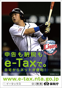 今年の国税庁確定申告「e-Tax」推進ポスターに浅村栄斗選手が登場し、「e-Tax」の利用促進・「納税者の自発的な納税義務の履行を適正かつ円滑に実現するため」のプロモーションアイテムとして、3月中旬まで確定申告会場、国税局、駅などに掲出されます。