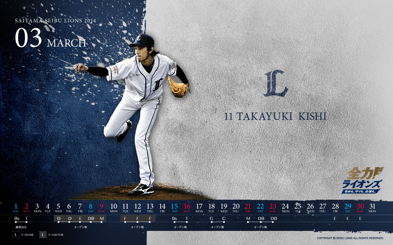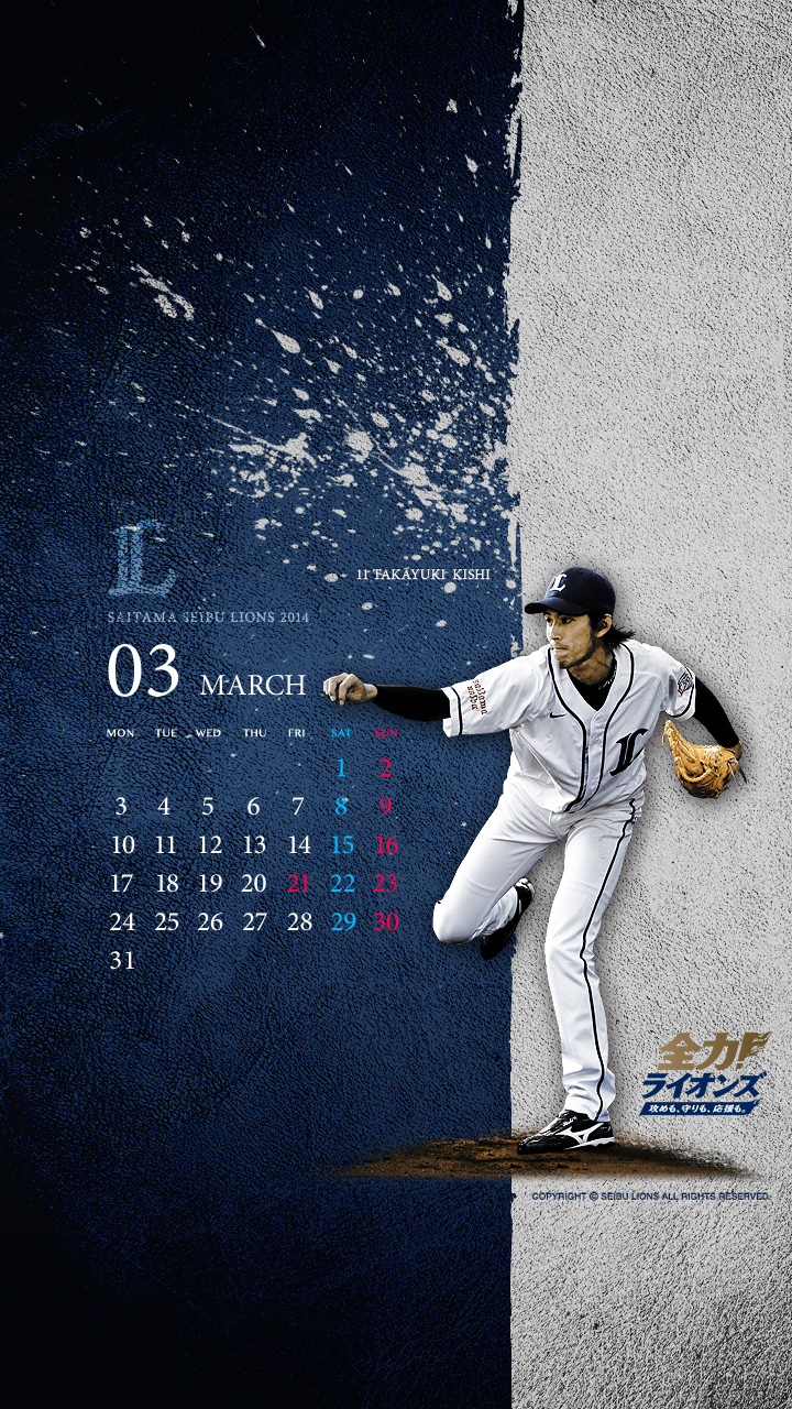 3月の壁紙・待受けカレンダーは、きたる3月28日(金)開幕戦に向けて調整を続ける、開幕投手候補の筆頭!岸 孝之投手デザインです!!