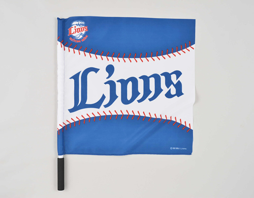 ライオンズの応援グッズに欠かせない「ライオンズ フラッグ」。今年はデザインがリニューアルし、種類も増加。ツインスティックバットや応援タオルも充実のラインナップ。