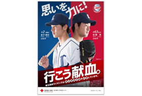 埼玉西武ライオンズでは、社会貢献活動の一環として、埼玉県民の皆さまへの献血意識の浸透と、献血に対する理解をより深めていただくため、佐藤勇投手と金子侑司選手が埼玉県赤十字血液センターの献血推進ポスターに登場し、PR活動を支援します。