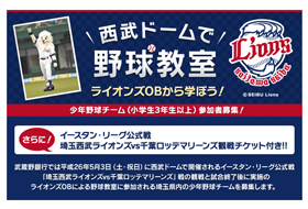5月3日(土・祝)に開催される、イースタン・リーグ公式戦vs千葉ロッテ戦 試合終了後に、憧れの西武ドームで実施するライオンズOBによる野球教室となります。