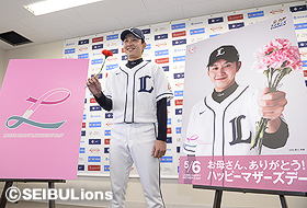 「この日は『LIONS HAPPY MOTHER’S DAY』ということなので、元気に産んでくれた、そしてプロ野球選手に育ててくれたお母さんに改めて感謝しながらプレーしたいと思います。ファンの皆さまも、この日はお母さんと一緒に西武ドームにご来場いただき、家族で楽しいひと時を過ごしていただければと思っています。そして、この日はこのロゴ(LIONS HAPPY MOTHER’S DAYロゴ)を帽子に付けて試合に挑みます。これをきっかけとして、少しでも多くの女性に乳がんと子宮頸がんの検診を受けるきっかけとなればと願っています。」