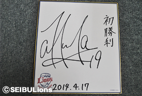 昨日4月17日(木)千葉ロッテ戦(西武ドーム)でプロ初勝利を挙げた豊田 拓矢投手から、初勝利を飾った当日に、日付入りの直筆サイン色紙をゲット! 公式スマートフォン・モバイルサイト会員限定でプレゼントさせていただきます!!