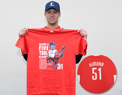 そんな木村選手に、「5 tool player」になってライオンズを勝利に導いて欲しい!という願いを込めて、「BECOME A 5 TOOL PLAYER」の文字を大きく入れ、さらに、木村選手が付けているリストバンド、バッティングレガースの色に合わせて「赤」をベースに、駿馬をイメージした木村選手のイラストをデザインしました。