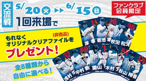 西武ドームで開催する日本生命セ・パ交流戦期間中(5/20~6/15)に、ご来場いただくだけで、ファンクラブ限定「オリジナルクリアファイル(非売品)」をもれなくプレゼント!
