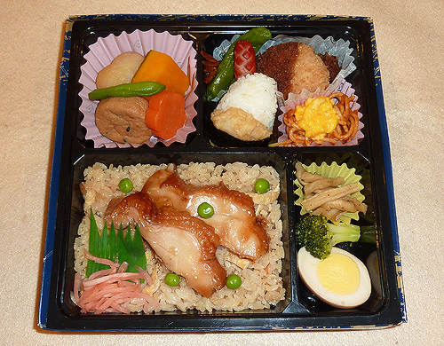 | 				 内容  | 							 鶏飯(鶏もも照り焼きのせ)・天むす・みそカツ・エビフライ(みそソース漬け)・煮物(ポテト煮・南瓜煮・梅にんじん煮・いんげん煮)・赤ウインナー・ゆで卵・大根漬け  |