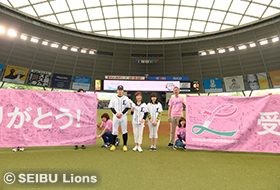 ファン参加型のイベントとしてピンクのメッセージボードを配布。更には特別仕様のピンクの塁ベースやビジョンなどピンク一色に染まった西武ドーム。特別ゲストには「がんサバイバー」松田陽子さんを招き、がん検診の啓発を行っていただきました。