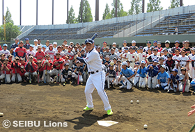 5月10日(土)上尾市主催により、市内スポーツ少年団に所属する21チームと友好のある岩手県陸前高田市スポーツ少年団所属1チーム、福島県本宮市スポーツ少年団所属5チームが「埼玉西武ライオンズ野球教室」に参加。ライオンズアカデミー岡村隆則校長、平尾博嗣コーチ、星野智樹コーチ、阿部真宏コーチ、ライオンズOBの土肥義弘氏が講師を務め、約250名の児童に技術指導と共に野球の楽しさを伝えました。