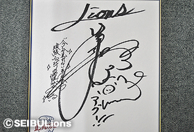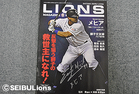 月間ベストプレーに選ばれたメヒア選手から、覚えたての日本語で、自身が表紙となったライオンズマガジン第6号に「メヒア」と書いた、貴重なサイングッズを公式スマートフォン・モバイルサイト会員の方に抽選で3名さまにプレゼント!