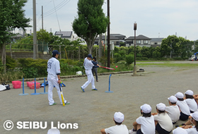 小学生を対象に、キャッチボールやティーボール体験を通じて投てき能力、体力向上に努め、野球の楽しみを体験していただく「キッズベースボール」プロジェクト。今回は埼玉県川口市立新郷小学校にて小学6年生4クラス148名の児童を対象に実施。ライオンズアカデミー阿部真宏コーチ、星野智樹コーチが講師を務め、野球の「楽しさ・面白さ」を伝えました。阿部コーチのバッティングのデモンストレーションでは、間近に見る元プロ野球選手の迫力に大歓声があがりました!