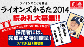 ファン・選手会・球団が三位一体となってこどもの明るい未来をサポートする「ライオンズこども基金」。本年度は“楽しく学べる”をコンセプトにオリジナルの「ライオンズかるた」を製作し、埼玉県内の小学校に寄付を行う事が決定いたしました!また、読み札内容をファン・地域の皆さまより募集します!採用された投稿者の方には、「ライオンズかるた」を贈呈いたします!