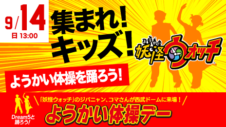 埼玉西武ライオンズでは、9月14日(日)東北楽天ゴールデンイーグルス戦において「Dream5と踊ろう!ようかい体操デー」を開催いたします。