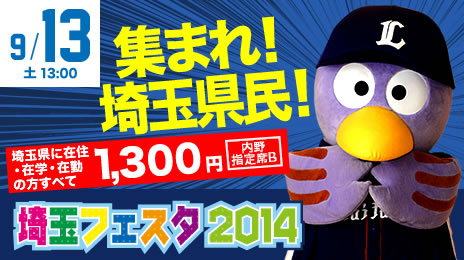 彩の国さいたま魅力づくり推進協議会(事務局:埼玉県)との共催イベントとして、9月13日(土)に行われる東北楽天ゴールデンイーグルス戦にて、「埼玉フェスタ2014」を開催いたします。
