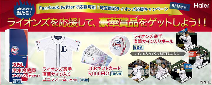 | 賞品 | 				【A賞】ライオンズ限定モデル305L冷凍冷蔵庫 1名さま 【B賞】ライオンズ選手サイン入りユニフォーム(Lサイズ) 3名さま 【C賞】ライオンズ選手サイン入りボール 5名さま 【D賞】JCBギフトカード5,000円分 10名さま  |