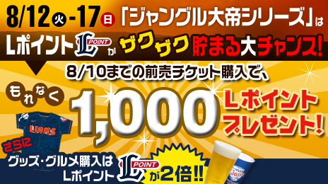 | 内容 | 8月10日(日)までに8月12日(火)~17日(日)の前売チケットを1試合以上購入された会員さまに、もれなく1,000Lポイントをプレゼント |