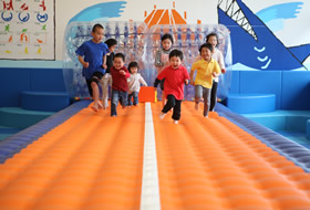 | 遊具提供協力 | エアトラック 空気の反発力を利用して、体中のバネが躍動する大きなトランポリン。 サイバーホイール 透明の大きなドーナツ状の中で、全身を使った360°回転運動が楽しめます。 |