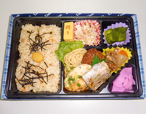 | 内容 | 鶏そぼろ焦がしネギ醤油ごはん、豆腐ハンバーグ、太刀魚の柚子胡椒焼き、牛スジ煮、竜田揚げ、きんぴらポテト、和風スパゲッティ、厚焼き玉子、抹茶のわらびもち |