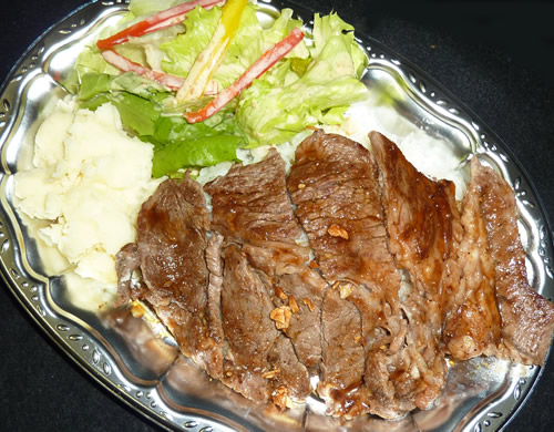 | 内容 | ごはん、ステーキ(BBQソース)、マッシュポテト、サラダ(胡麻ドレッシング) |