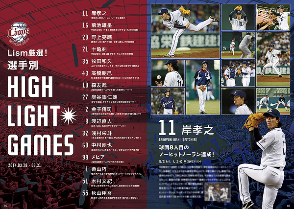 今回はシーズン最終号!ということで、注目特集は今シーズンのライオンズの戦いを選手ごとにピックアップした「選手別HIGH LIGHT GAMES」 。岸投手のノーヒットノーランやルーキー森選手の3試合連続本塁打など、その選手が輝いた試合をLism編集部がピックアップし振り返ります! シーズンが終わる最後の一戦まで戦い抜くライオンズの選手たちのプレーを観ながら、あなたもお気に入りの選手の活躍を振り返ってみてください。