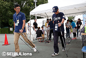 シニアの皆さんに試合観戦を楽しんでいただくとともに、家族皆さんで楽しく健康になれるイベントとして、「健康長寿!体験エリア」がドーム前広場に登場。アミューズメント・カジノや卓上カーリング、ノルディックウォーキングの体験コーナーのほか、血管年齢や肺年齢の測定、栄養士への健康相談が無料でできるブースを設置。参加者は「いかに自分の健康チェックを怠っていたかわかった」、「久々に孫と一緒に遊べて幸せでした!」など、体験エリアを満喫していました。また始球式には、今シーズンの埼玉西武ライオンズ主催試合全試合にご来場いただいているファンクラブ会員で最高齢のご夫妻にご登場いただきました。始球式で見事な投球を披露すると、「おーっ」というどよめきに場内が包まれました。