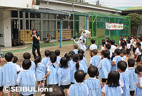 こどもたちへの心身育成活動の一環として実施している「レオ・ライナと楽しく遊ぼう!」プロジェクト。9月もさまざまな施設を訪問し、約850名のこどもたちと触れ合いました。レオ・ライナの登場に喜び、はしゃぐこどもたちの様子が見られ、最後まで元気良くレオ・ライナと野球体験を行っていました。