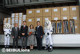 代表として埼玉西武ライオンズ専務取締役の飯田則昭から、公益財団法人埼玉YMCAの桒原道子代表理事へ用具が手渡されました。その後、ファンの皆さんから寄付していただいた思い出いっぱいの野球用具を乗せたトラックが、株式会社トランスコンテナのご協力のもと、フィリピン共和国へ向けて西武ドームを出発いたしました!