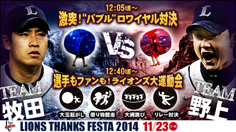 MY PAGE11月23日(日・祝)開催の「LIONS THANKS FESTA 2014」内で実施する選手プロデュースエキシビションの競技が決定! 今年の選手プロデュースエキシビション競技は「激突!“バブル”ロワイヤル対決」を実施します!!