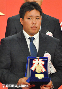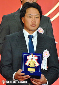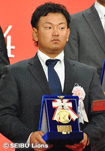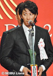 埼玉西武ライオンズから、勝率第一位投手賞を受賞した岸孝之投手、最多本塁打者賞、ベストナイン(指名打者部門)を受賞した中村剛也選手、同じく最多本塁打者賞、ベストナイン(一塁手部門)を受賞したエルネスト・メヒア選手(当日欠席)、さらに2年連続となるスピードアップ賞(パ・リーグ連盟特別表彰)を受賞した栗山巧選手が出席し表彰を受けました。
