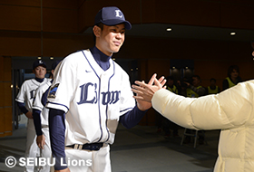 出迎えた田邊監督は、「6名の選手は名前とプレースタイルをファンの皆さんに覚えていただいて、押しも押されもせぬ埼玉西武ライオンズのプレイヤーとなってがんばってもらいたい」という言葉をかけ、6選手を激励しました。