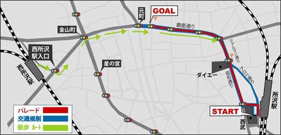 | ◆ | 沿道にてパレードをご覧なるお客さまで、ファルマン通り交差点(根岸交差点)からパレード終着地方面へお越しのお客さまは、西所沢駅からのご来場が便利となります(徒歩10分程度)。 ![]() |