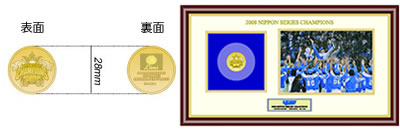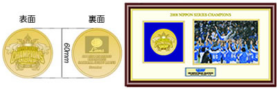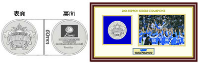 この公式記念メダルは、ライオンズ協力のもとに発行される貴重な逸品で、メダル表面には、日本一のロゴを謹刻したデザインし、裏面には、球団旗と優勝日を謹刻したデザインをあしらいました。