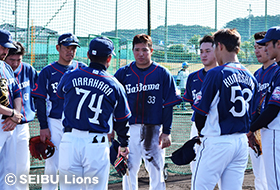キャッチャーに森・炭谷・岡田・上本、ファーストに山川・メヒア、セカンドに金子侑・浅村、サードにセラテリ・脇谷・中村、ショートに熊代・永江、レフトに栗山・米野・石川、センターに木村・秋山、ライトに梅田・坂田が入り、それぞれ状況別にノックを受けたり、連係を確認したりしていました。
