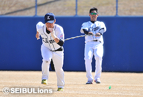 ウォーミングアップ後の総合練習ではキャッチャー陣がサードの定位置に入り、河田コーチのノックを捕球。各選手はノックを受ける前に元気な声で呼び、ボールを捕っていきます。途中からはしゃがんだ状態からノックを受けたり、タッチプレーが入ってきます。