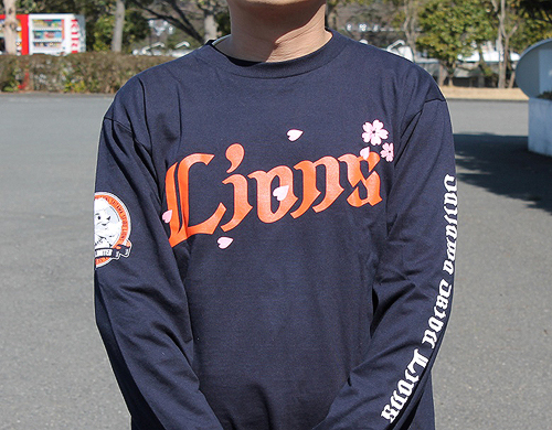 胸のライオンズワードマークは開催地大宮区の色「オレンジ」を採用、さらに大宮区の花である「さくら」の花びらを散りばめたご当地イメージと季節感あふれるデザインのTシャツに仕上がりました。