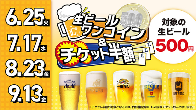 生ビールワンコイン&チケット半額デー(内野指定席B・C)を今シーズンは4試合で開催!
