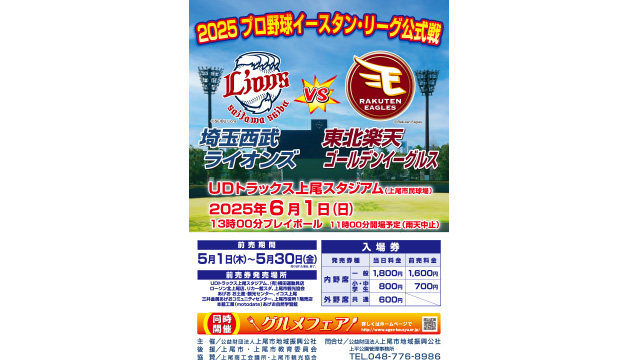 6/1(日)イースタン・リーグ公式戦 上尾市民球場開催のお知らせ