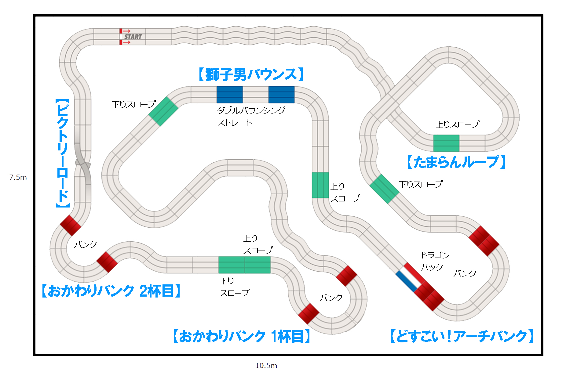 3周で全長約154m。平面の速さはもちろん、ジャンプ時の姿勢が重要になりそうなテクニカルなレイアウトです。勝負所となりそうなのは、前半の「たまらんループ」と中盤の「獅子男バウンス」。「たまらんループ」は、上りと下りのスロープともに着地の距離が短いので、ローラーやブレーキのセッティングが重要。「獅子男バウンス」は車体が小刻みに浮くバウンシングストレートが含まれているので、マスダンパーという動くおもりでのショック吸収が勝利の鍵です!(文:ミニ四駆アドバイザー アスト)