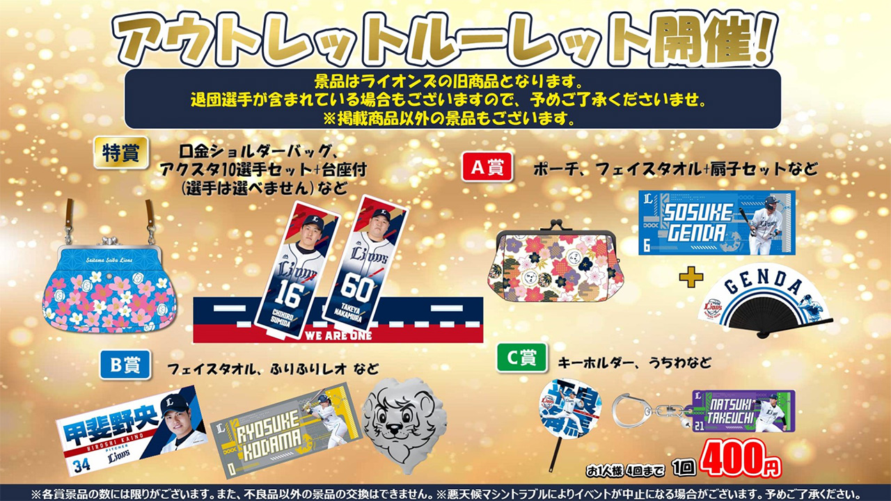 大好評『アウトレットルーレット』を実施します!おトクな価格でライオンズグッズを手にいれよう!